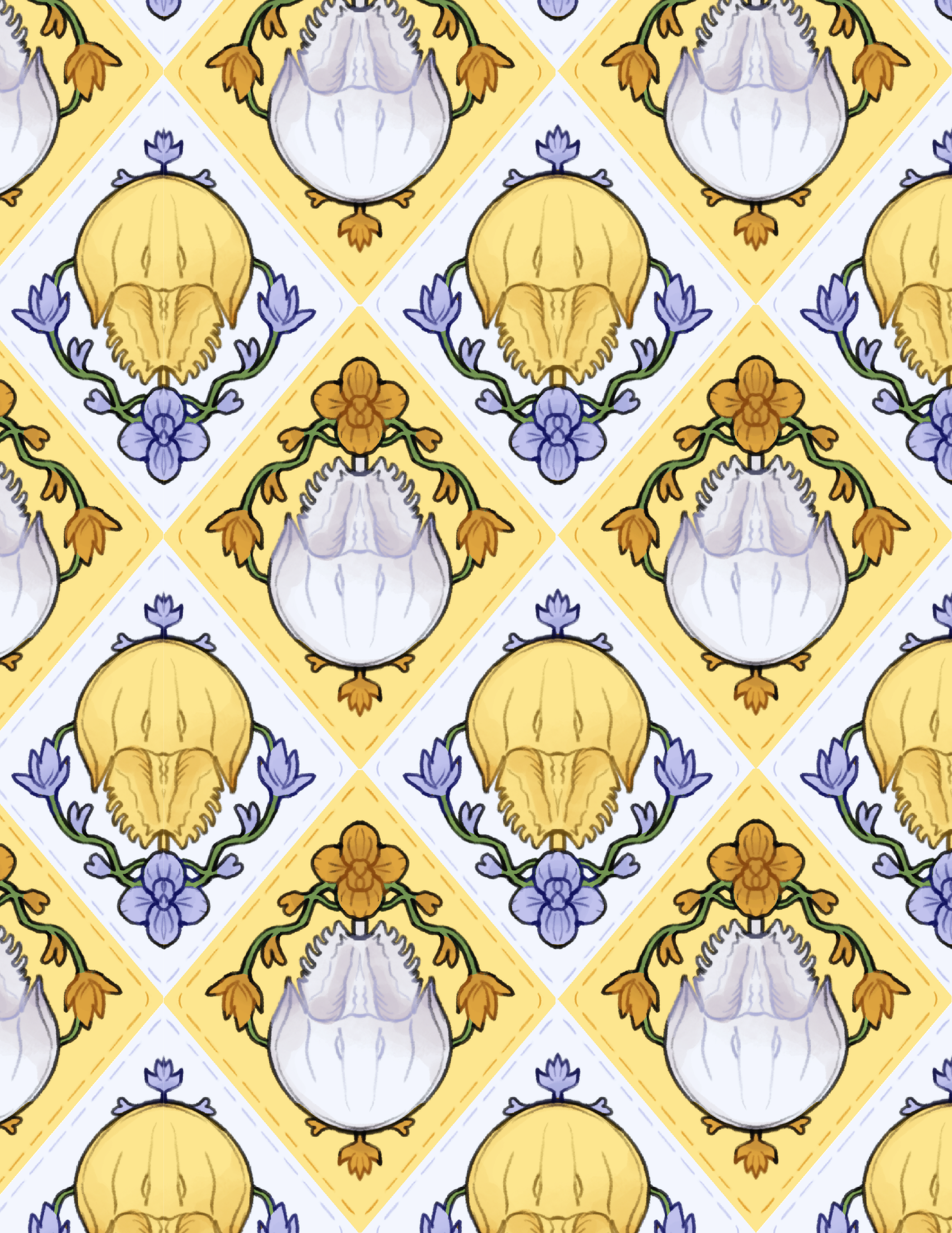2026, MeA pattern that represents me! Including horseshoe crabs and larkspur flowers in a quilt pattern.